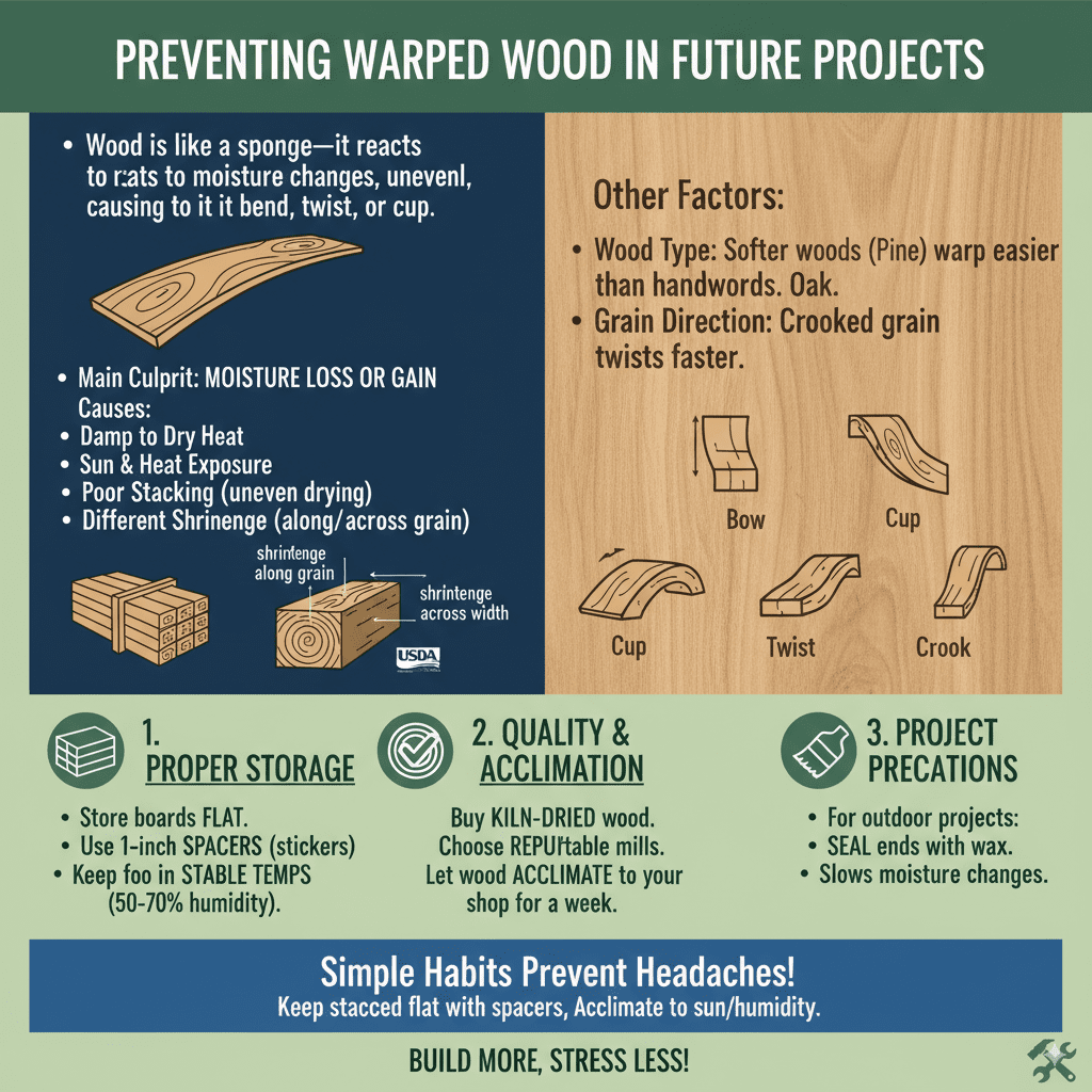 Fixing is great, but stopping warps saves time. Store boards flat, stickered with 1-inch spacers every foot. Keep in stable temps—50-70% humidity is ideal. Buy kiln-dried wood from reputable mills, and let it sit in your space a week before cutting.