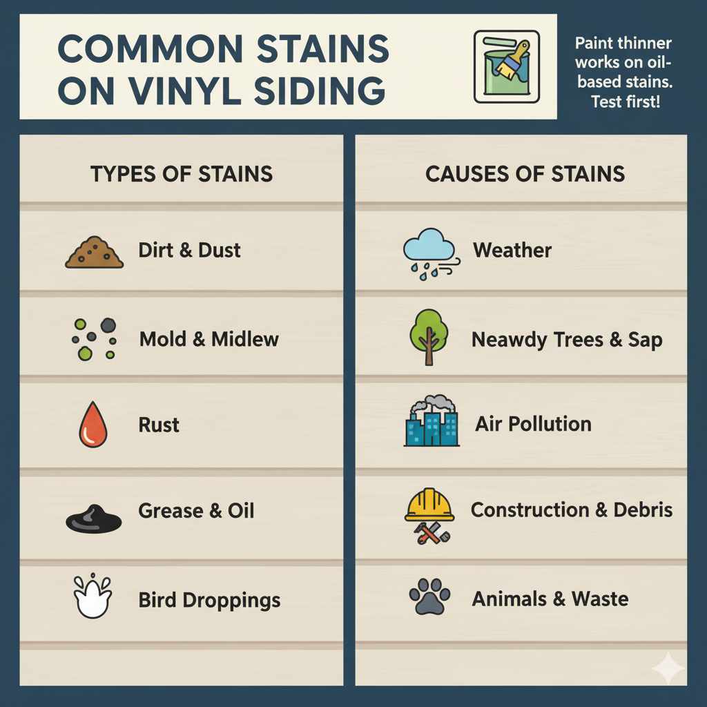 Vinyl siding often faces different stains. Dirt and dust are common. Mold and mildew also appear in damp areas. Rust can stain siding if metal is nearby. Grease and oil stains can come from cars or grills. Bird droppings leave marks, too. Each stain needs a different cleaning method.